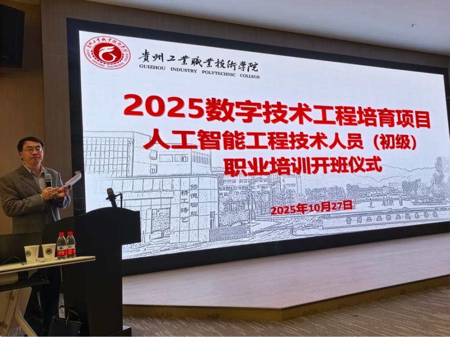 2025年10月27日,由贵州省人社厅主办、贵州工业职业技术学院大数据与信息工程系承办的“2025年数字技术工程培育项目——人工智能工程技术人员(初级)职业培训班”正式开班,该班是全国首个数字技术工程培育项目人工智能工程技术人员应用产品集成实现方向培训班,主要面向省内高等院校、职业院校从事数字技术、人工智能等相关专业教学的专兼职教师,以及省内普通高校数字经济相关专业2025届全日制应届毕业生,正在从事或拟从事数字经济、人工智能等相关领域工作的企业从业人员。培训时间为2025年10月27日至2025年11月2日。