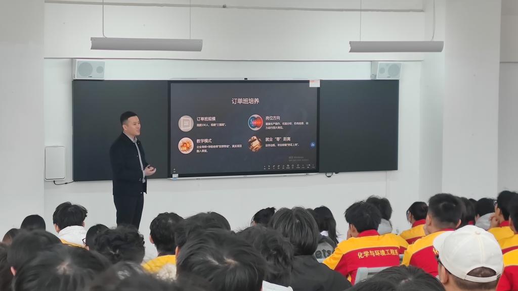 为深化产教融合、搭建校企协同育人平台,助力学生高质量就业,2025年11月14日,贵州三强新能源有限公司人力资源部部长高瑀一行走进贵州工业职业技术学院,面向化学与环境工程系、智能制造工程系学生开展专场宣讲会及订单班人才选拔活动。活动通过企业展示、互动答疑、现场面试等环节,为学子们提供了直通企业的绿色通道,吸引了190余名学生积极参与。