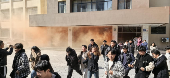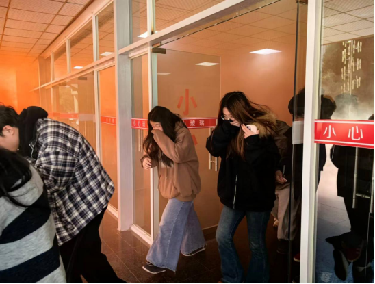 随后,实战演练环节拉开序幕。警报声响后,党委保卫工作部应急指挥体系迅速启动,各系指导教师引导楼内师生用湿毛巾捂住口鼻,弯腰低姿,沿着安全通道快速有序撤离教学楼到指定安全区域。在撤离过程中,参与人员严格按照演练要求,听从现场工作人员的指挥,不慌乱、不拥挤,迅速完成撤离。