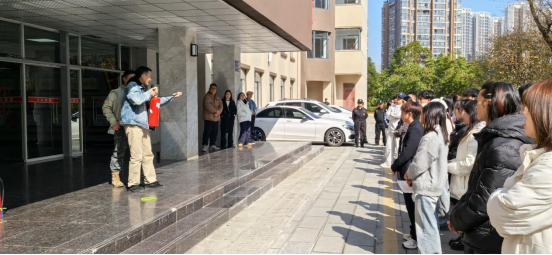 演练前,消防专员田茂晶老师在实训楼广场开展消防安全知识培训。深入浅出地讲解了火灾的成因、火灾初期的扑救方法、火灾中疏散逃生的技巧以及灭火器、消防栓等消防器材的正确使用方法。“使用灭火器时,要牢记‘提、拔、握、压’四字口诀,提住灭火器瓶体,拔掉保险销,一手握住喷管,另一手按压压把,对准火焰根部进行喷射。”保卫干事田茂晶一边讲解,一边现场演示了灭火器的操作步骤。