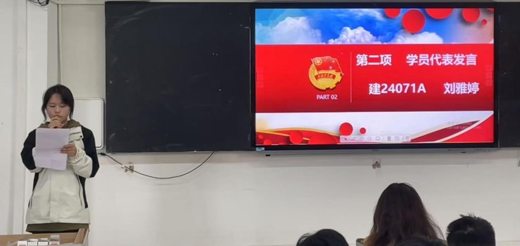 建工23071A班刘雅婷同学作为团员代表作表态发言,她表示作为一名团员,要牢记自身肩负的责任和使命,始终遵守团员义务和权利,积极参与团组织的各项活动,努力学习团的知识,不断提高自己的思想政治素质和业务能力。