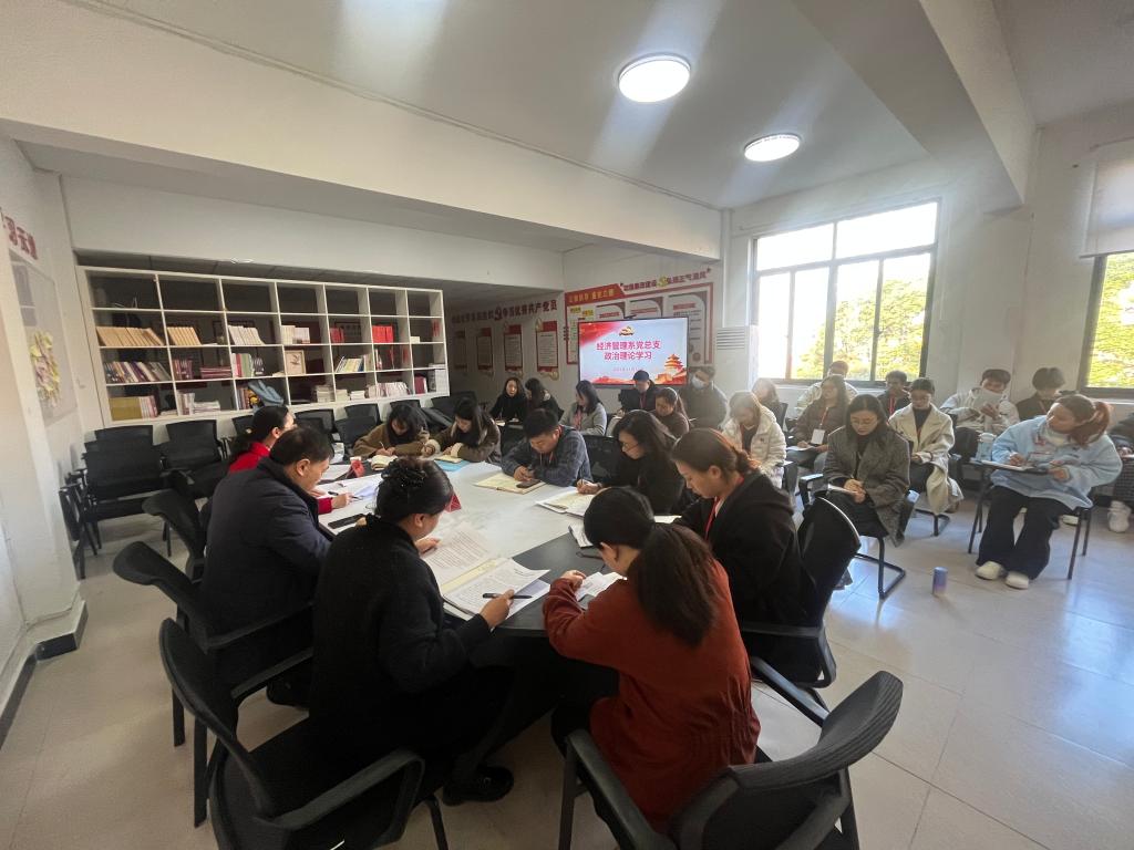 11月26日上午,经济管理系党总支组织全体教师参加政治理论学习会,本次会议由党总支副书记张凤主持,学院党委书记蔡志坚、党委宣传统战部综合科科长刘馨列席会议。