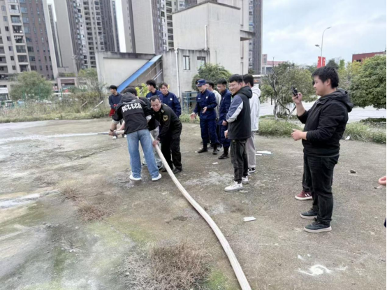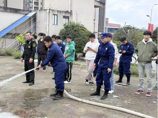 演练环节中,模拟“突发火情”,进入实操阶段,师生代表分组上前,在田老师指导下依次操作灭火器扑灭模拟火点,上手连接消防水带、对准目标完成喷水动作。从灭火器压柄按压到水带接口快速对接,每一步操作都在教官的纠正与鼓励中完成,有效打破了师生对消防器材的“陌生感”。让师生熟练掌握了灭火器与消防水带的实操技能,更提升了校园整体应急反应能力,为建设平安校园奠定了坚实基础。
