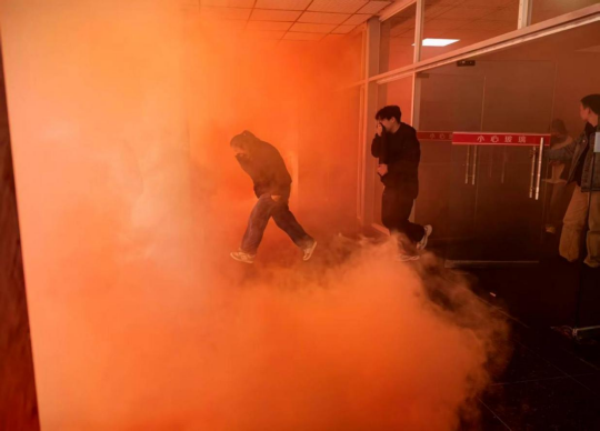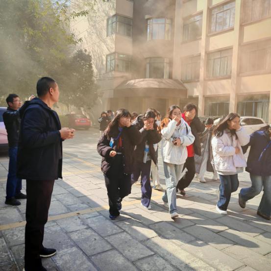 随后,实战演练环节拉开序幕。警报声响后,党委保卫工作部应急指挥体系迅速启动,各系指导教师引导楼内师生用湿毛巾捂住口鼻,弯腰低姿,沿着安全通道快速有序撤离教学楼到指定安全区域。在撤离过程中,参与人员严格按照演练要求,听从现场工作人员的指挥,不慌乱、不拥挤,迅速完成撤离。