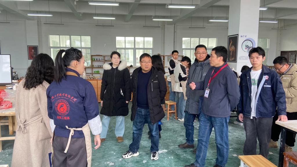 考察组依次参观了民族工艺品展厅、施工实训场、民族手工艺实训室、陶艺与雕塑实训室、建筑工程综合服务实训室等。参观结束后考察组与建筑工程系党政领导班子成员及各专业中心主任在图书馆101会议室召开交流座谈会。