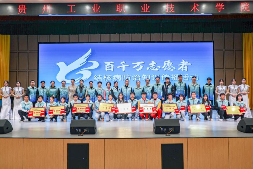 启动仪式上,贵州省防痨协会授予贵州工业职业技术学院“结核病防治知识传播活动百千万志愿者选拔培训基地”牌匾并授旗。