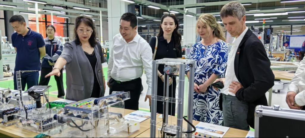 会议结束后,学院领导陪同德国与广州易德教育科技有限公司嘉宾参观中德智能制造赛训中心。嘉宾们实地考察实训设备、教学场景与“小载体”项目实践成果,深入了解学院双元制教育的落地细节与产业对接模式。为后续细化合作方案、推动“小载体”项目出海及课程体系国际认可奠定坚实基础。