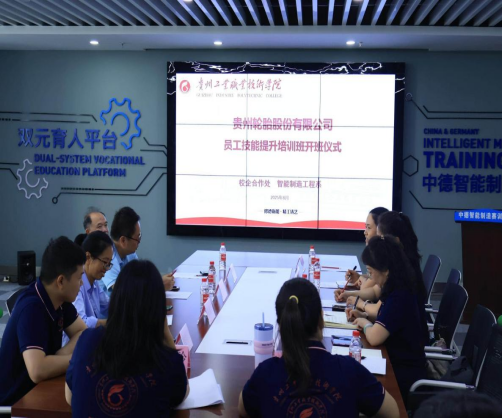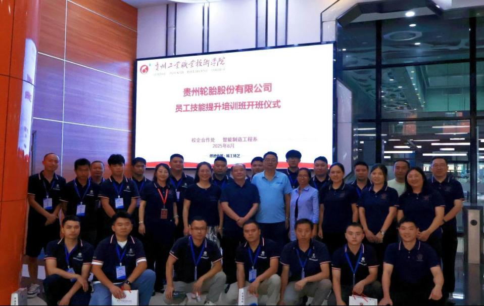 2025年8月31日,贵州轮胎股份有限公司员工技能提升培训班开班仪式在贵州工业职业技术学院中德智能制造赛训中心举行。贵州轮胎股份有限公司工会主席阳华、人力资源部副部长李声建、贵州工业职业技术学院校企合作处处长陈怡、智能制造工程系主任李莉娅、副主任韩鹂出席开班仪式。