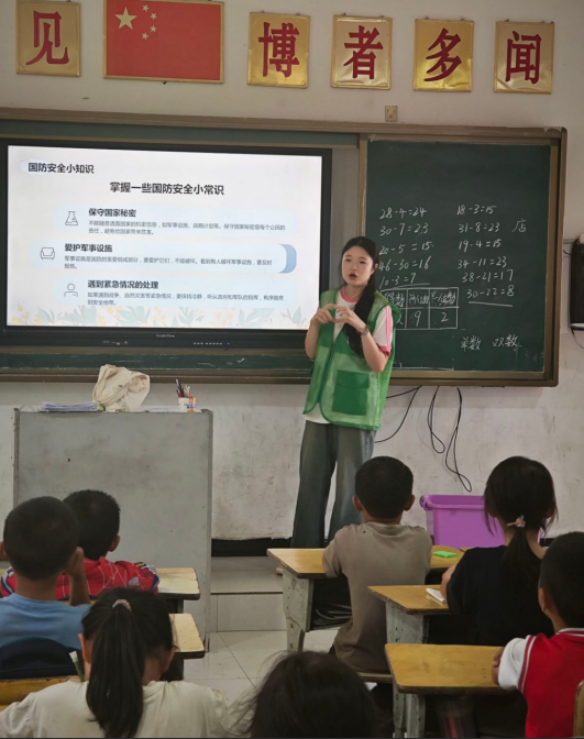 实践团主动对接九溪村小学,打造“国防教育 + 意识形态安全”融合课堂,将国家安全知识转化为生动鲜活的思政教材。队员们借助短视频、安全绘本等载体,通过情景模拟、互动问答等形式,向孩子们普及国家安全基本常识,阐释 “国家安则小家宁”的深刻内涵。课堂上,学生们积极参与、踊跃发言,纷纷表示立志成为 “国家安全小卫士”。此次活动不仅补齐了乡村小学系统性安全思政教育的短板,更将国家安全理念根植于青少年心中,为构建家校社协同的安全育人体系夯实基础。