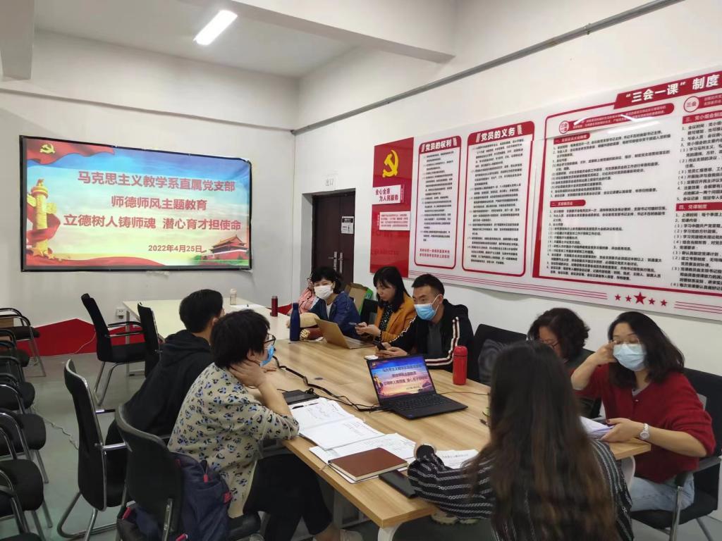 为深入贯彻落实党的十九届六中全会精神,努力办好人民满意教育,增强教师教书育人的荣誉感和责任感,根据学院党建工作及师德师风建设有关要求,马克思主义教学系直属党支部于2022年4月25日在全系开展“立德树人铸师魂 潜心育才担使命”主题教育。