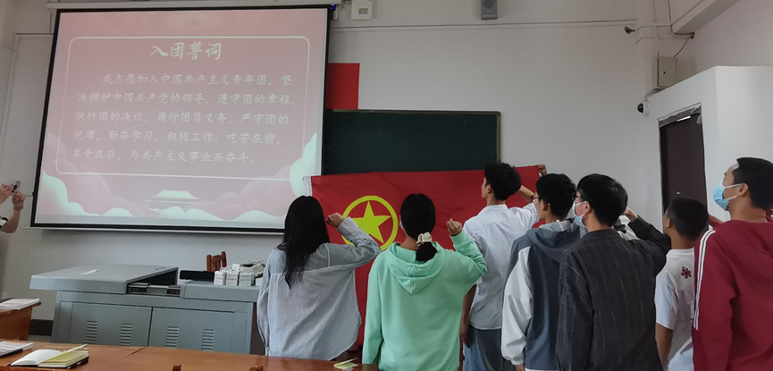 主持人刘新梅宣布入团仪式开始。仪式进行第一项,全体起立,奏唱国歌。随后组织委员熊洪萍宣读新团员名单并领学了《中国共产主义青年团章程》中有关团员义务和权利的条款。老团员代表为新团员颁发并佩戴了团徽。仪式上播放了“建团百年”主题宣传片《共青春》。在领誓人的带领下,7名新团员面对展开的鲜艳团旗,举起右手庄严宣誓:“我志愿加入中国共产主义青年团,坚决拥护中国共产党的领导,遵守团的章程……”铮铮誓言,彰显着共青团员的责任与担当。随后,新团员代表徐梅和老团员代表王正贵相继发言,分别表达出新团员们铭记入团初心、实践入团誓言的决心,以及老团员对新团员们的衷心祝贺。