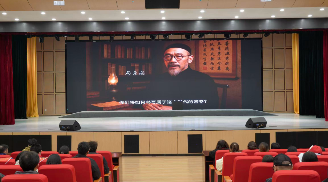 “时空对话・信念回响”的篇章缓缓展开,周素园数字人 AI 视频破壁而来,五分钟的光影流转里,先辈仿佛跨越岁月长河,与当代青年轻声对话,那份矢志不渝的信仰,在礼堂中静静流淌、深深扎根。贵州省话剧团携《周素园》登场,七十分钟的演绎如史诗长卷,“一袭长衫的信仰之路”在演员们的深情诠释下鲜活绽放,周素园先生的精神轨迹与家国情怀,引得掌声与敬意交织回荡。“时代问答・青春誓言”点燃互动热潮。十五分钟里,学子们以赤诚回应 “周老之问”,将个人理想融入时代答卷,思政教师的点拨升华,让家国情怀在交流中愈发厚重。“山河如愿・薪火相传”,学生代表领唱《如愿》,旋律伴着背景 MV 悠扬而起,全场师生共唱,用歌声告慰先烈、续写初心,让炽热的情感在礼堂上空激荡,将活动推向动人高潮。