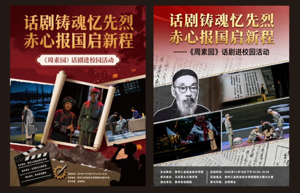 2025 年 11 月 18 日,贵州省话剧团带着精心编排的《周素园》话剧走进校园,现场近千名师生沉浸式感受着这场艺术思政课,引发学生强烈共鸣。此次活动由贵州工业职业技术学院主办,马克思主义教学系承办,全校师生积极参与,共同开启了一场兼具艺术魅力与思政内涵的特殊课堂。