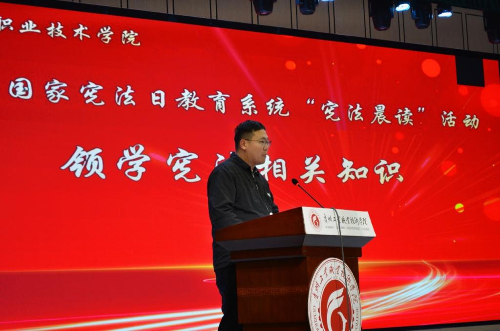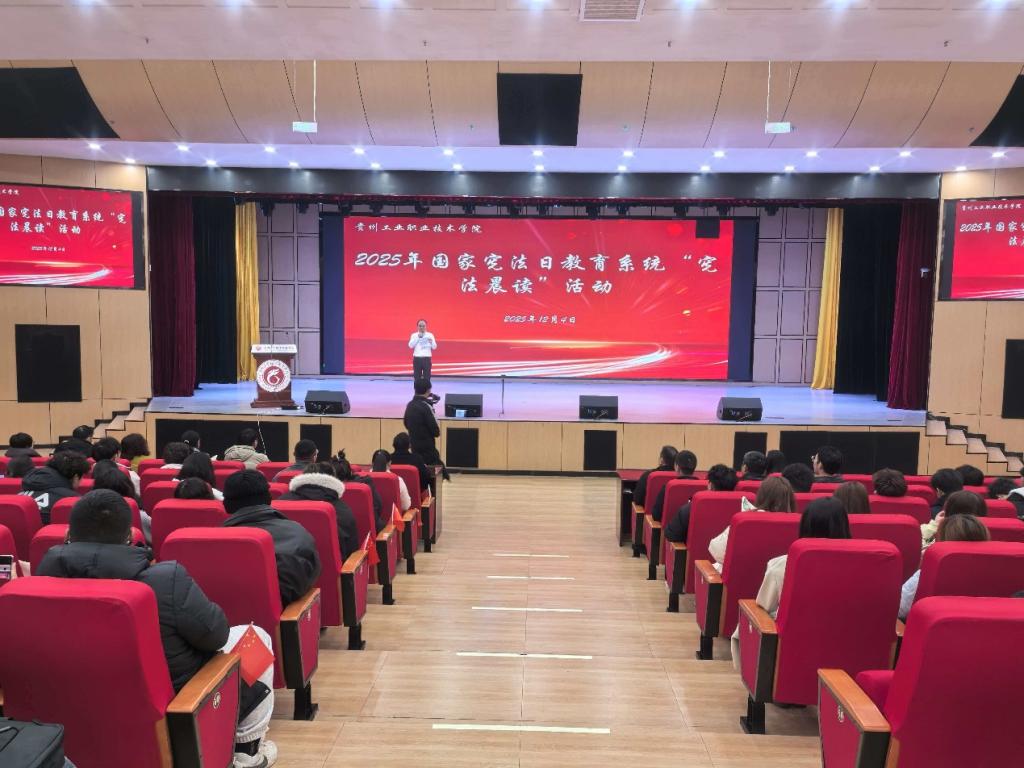 2025年12月4日,我国迎来第十二个国家宪法日。贵州工业职业技术学院作为贵州省分会场承办单位,隆重举办了2025年国家宪法日“宪法晨读”活动。本次活动以“宪法伴我成长”为主题,通过“线上+线下”联动,与北京主会场及全国师生同步开展宪法学习,打造了一堂具有仪式感与参与感的法治公开课,切实推动宪法精神在青年学生心中扎根生长、蔚然成风。