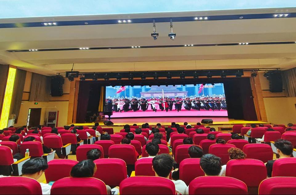 当直播进行到升旗仪式时,国歌奏响,全体师生迅速起立,目光坚定地注视着屏幕上的五星红旗,齐声高唱国歌,歌声激昂,饱含着爱国的赤诚之心。观看现场,师生们沉浸在庄严而激昂的氛围中,目光始终紧紧追随着屏幕上的画面。受阅方队的整齐程度、装备的先进水平,无不让他们深感震撼,爱国之情在心底熊熊燃烧。
