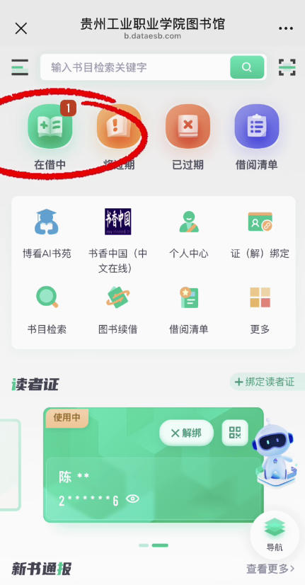 六、想查看自己的借阅情况,同样在学院公众号,智慧图书馆页面,可以查看自己所借书籍的具体借阅日期及应还日期。