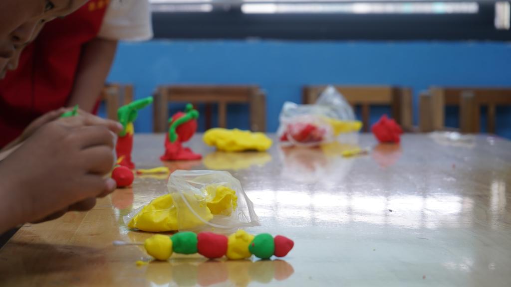 图为清镇市特殊教育学校培智一年级学生粘土作画过程及成果展示