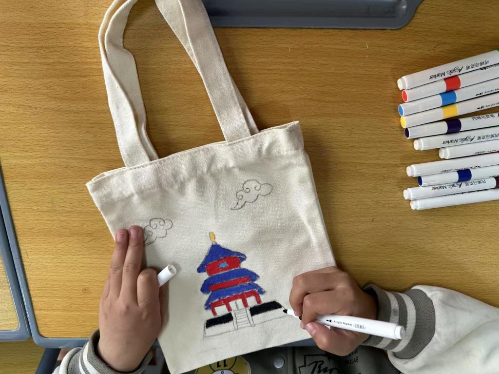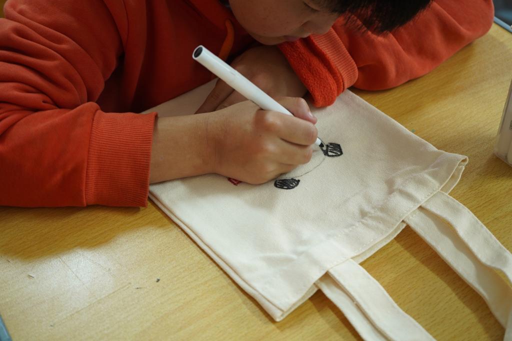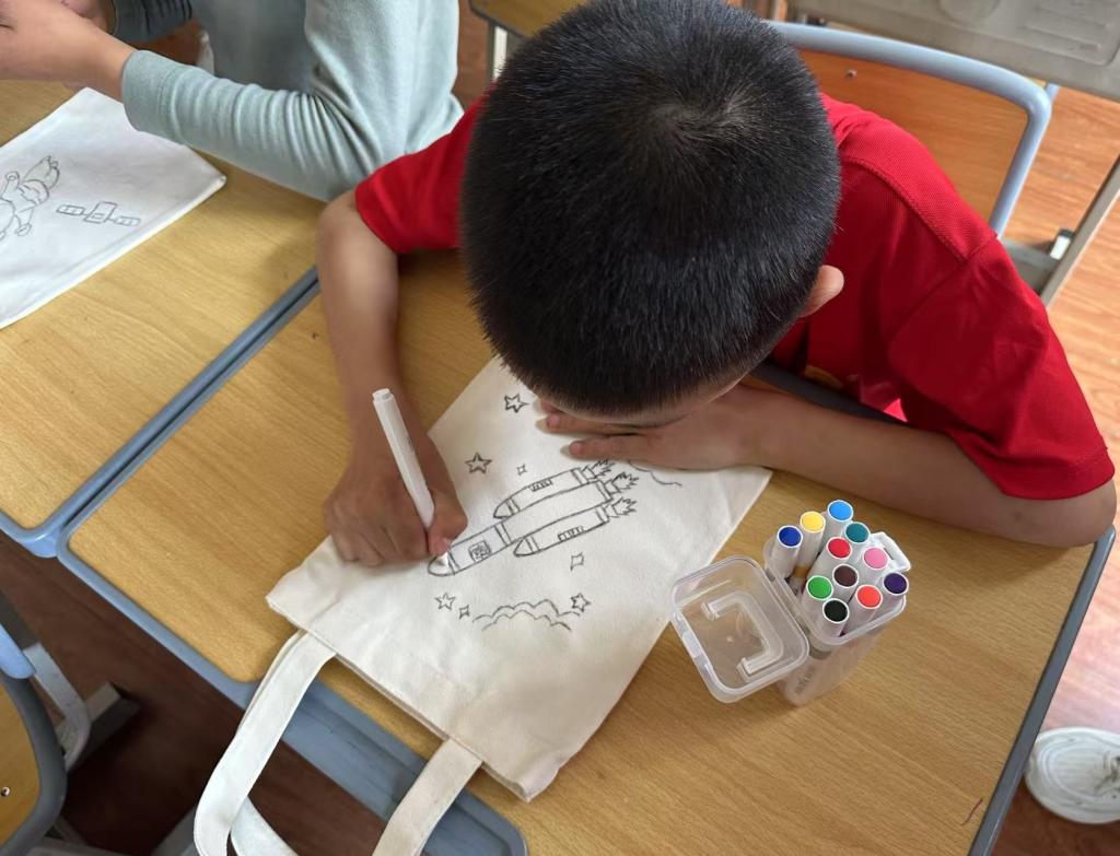 为了将中华优秀传统文化植根于儿童心中,志愿服务实践团队来到清镇市特殊教育学校培智五年级,以“色彩表达爱国情怀”为主题,开启了一场“视觉-触觉-情感”三重浸润的爱国教育实践。通过着色印制有中国标识、中国建筑、中国科技的帆布包,与特殊教育学校共建思想政治教育课堂,将爱国教育融入特殊教育当中,有效培养和提升同学们的爱国情怀,帮助特殊儿童建立对国家文化的具象认知与情感联结。