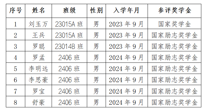 根据《贵州工业职业技术学院国家奖学金评定办法》《贵州工业职业技术学院国家励志奖学金评定办法》及学生资助中心名额划分,我系2024-2025年度国家奖学金名额1人,国家励志奖学金7人。通过系部奖学金评定小组依据学生家庭经济情况、学习成绩、综合素质、思想德育给予评定,拟推荐以下8名同学参评,名单如下: